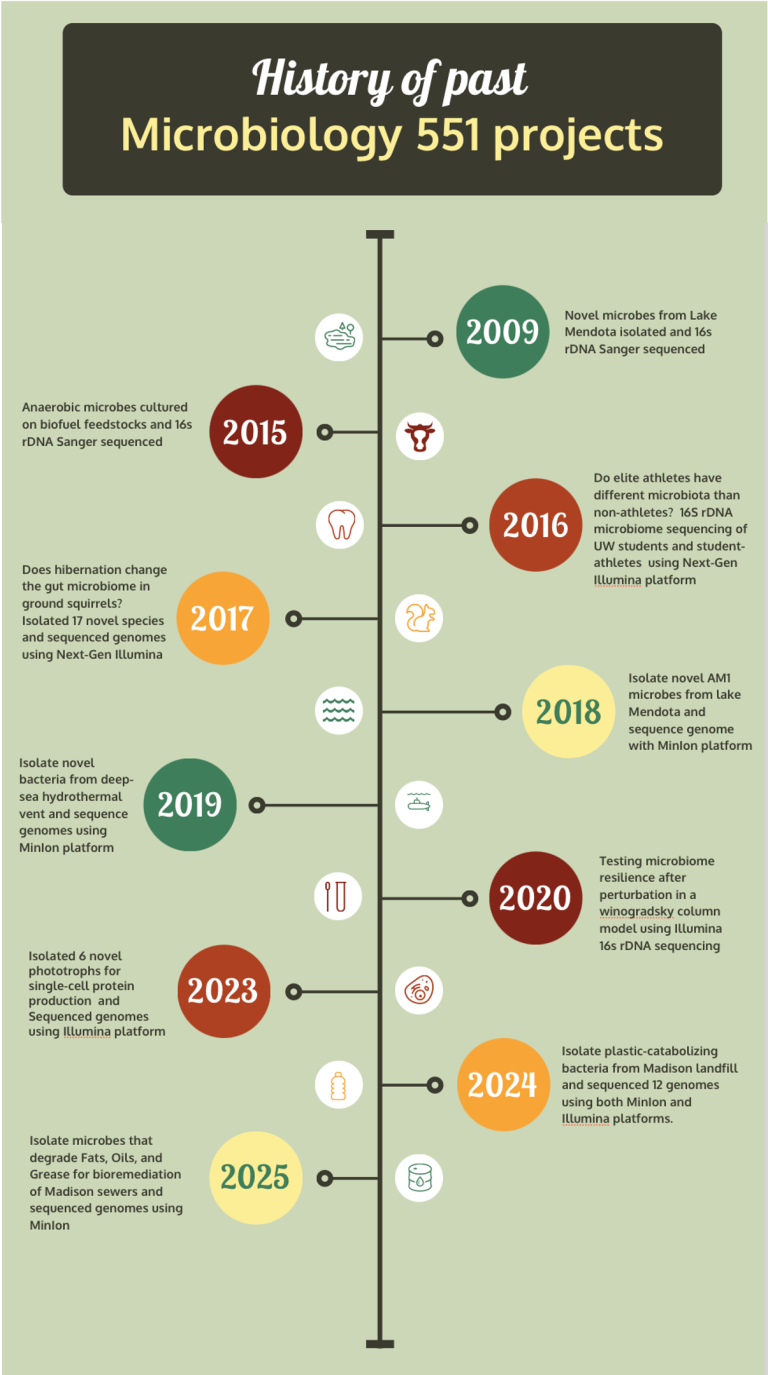 This capstone research class will encourage students to explore the diversity of microbiota in specific environment, isolate previously uncultured organisms, sequence the microbiome or the genomes of newly cultivated microbes, and test genomic predictions using bench experiments all while developing teamwork, resourcefulness, troubleshooting, oral and written scientific communication, scientific ethics, and an appreciation for the significance of Microbiology on the UW-Madison campus.